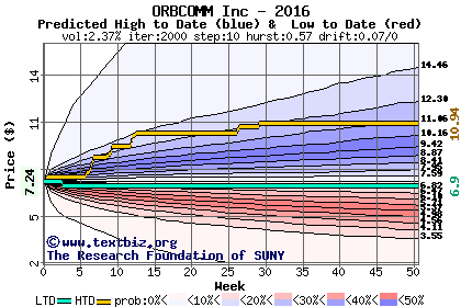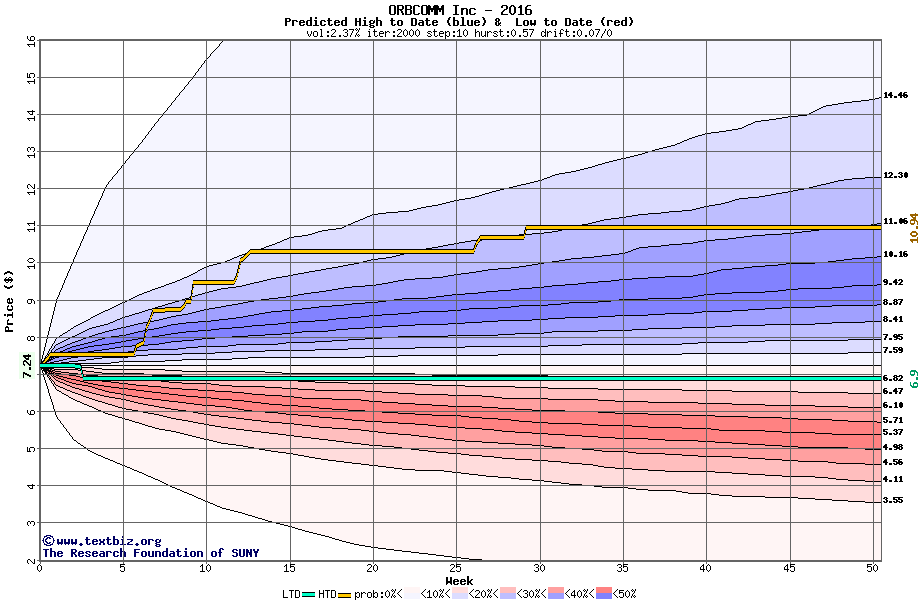 The high to date and low to date prices of the stock plotted against a random walk model for 2016 (what's this?).