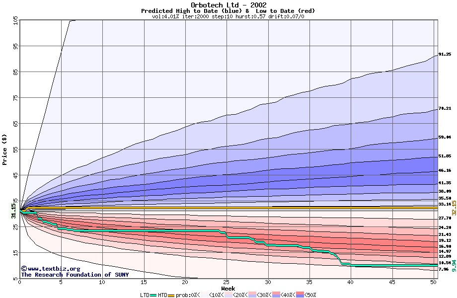 The high to date and low to date prices of the stock plotted against a random walk model for 2002 (what's this?).