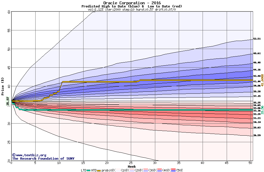 The high to date and low to date prices of the stock plotted against a random walk model for 2016 (what's this?).