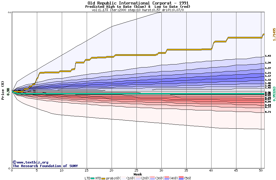 The high to date and low to date prices of the stock plotted against a random walk model for 1991 (what's this?).