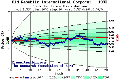 The high to date and low to date prices of the stock plotted against a random walk model for 1993 (what's this?).