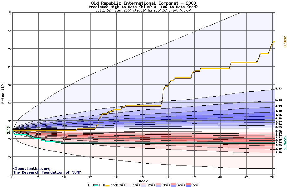 The high to date and low to date prices of the stock plotted against a random walk model for 2000 (what's this?).