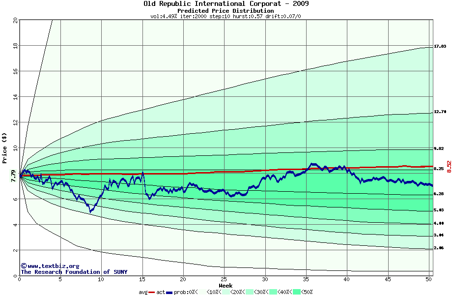 The following graph plots the year-to-date performance of the stock for 2009 compared to the probability calculated by a random walk model.