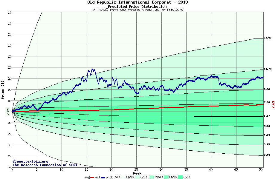 The following graph plots the year-to-date performance of the stock for 2010 compared to the probability calculated by a random walk model.