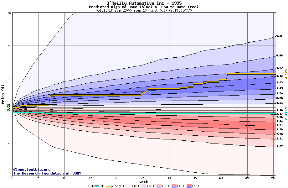 The high to date and low to date prices of the stock plotted against a random walk model for 1995 (what's this?).