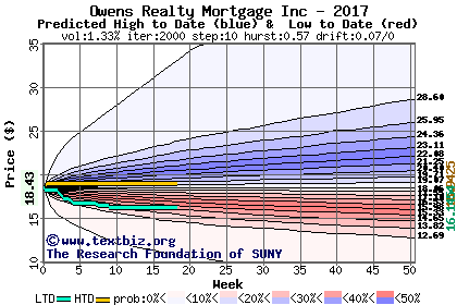 The high to date and low to date prices of the stock plotted against a random walk model for 2017 (what's this?).