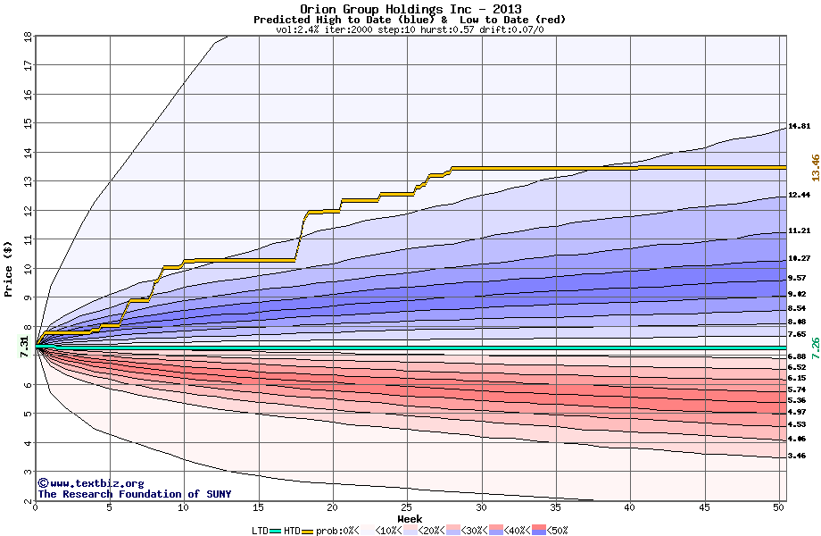 The high to date and low to date prices of the stock plotted against a random walk model for 2013 (what's this?).
