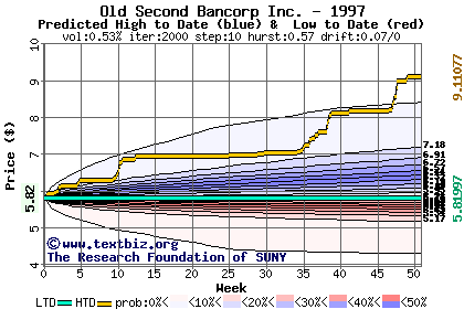 The high to date and low to date prices of the stock plotted against a random walk model for 1997 (what's this?).