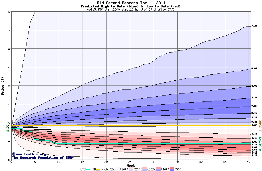 The high to date and low to date prices of the stock plotted against a random walk model for 2011 (what's this?).