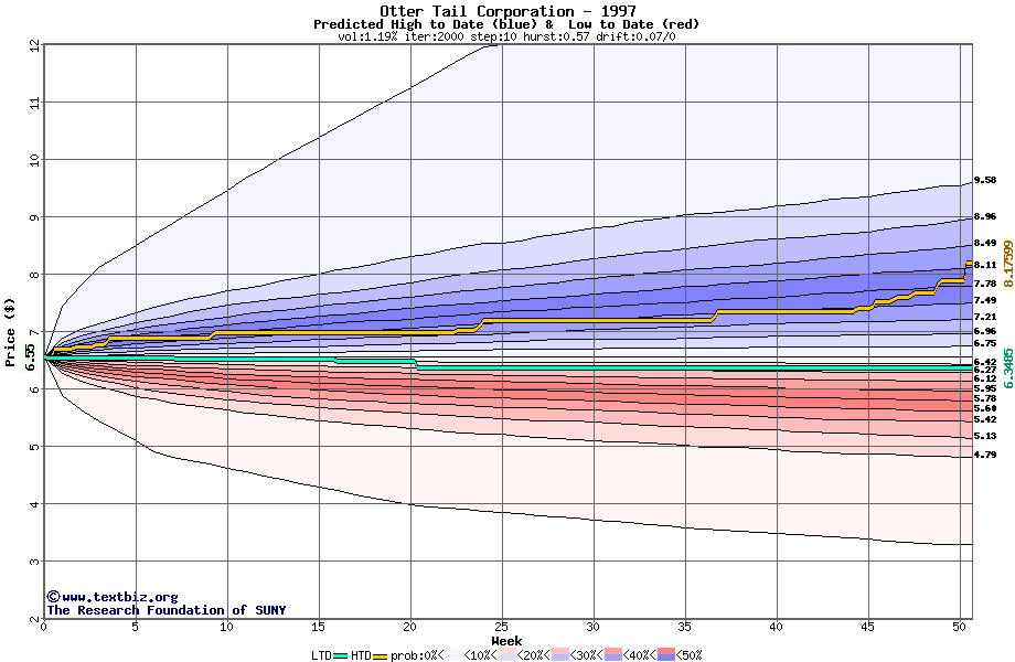 The high to date and low to date prices of the stock plotted against a random walk model for 1997 (what's this?).