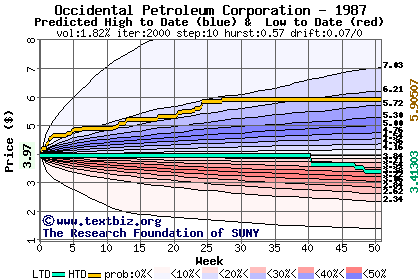 The high to date and low to date prices of the stock plotted against a random walk model for 1987 (what's this?).