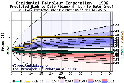 The high to date and low to date prices of the stock plotted against a random walk model for 1996 (what's this?).