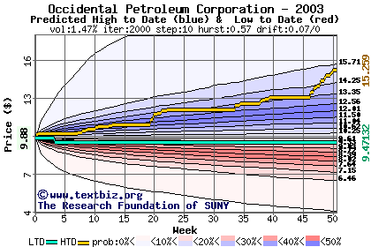 The high to date and low to date prices of the stock plotted against a random walk model for 2003 (what's this?).