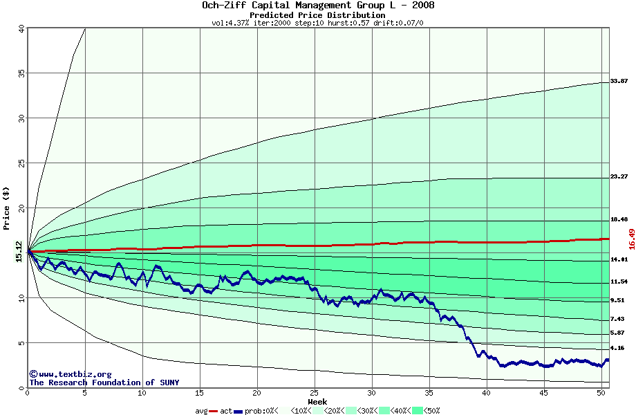 The following graph plots the year-to-date performance of the stock for 2008 compared to the probability calculated by a random walk model.