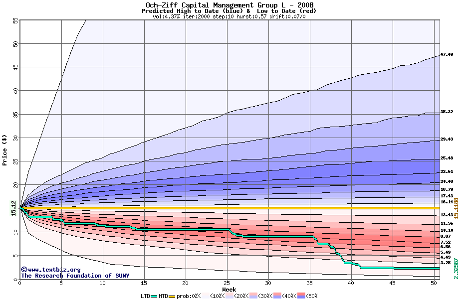 The high to date and low to date prices of the stock plotted against a random walk model for 2008 (what's this?).