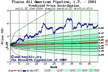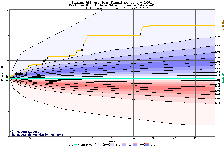 The high to date and low to date prices of the stock plotted against a random walk model for 2001 (what's this?).