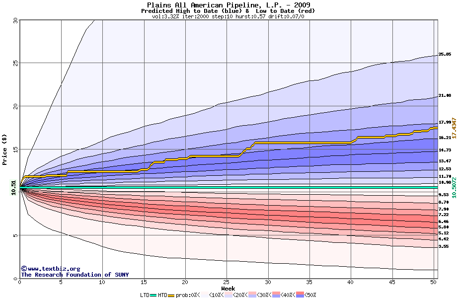 The high to date and low to date prices of the stock plotted against a random walk model for 2009 (what's this?).