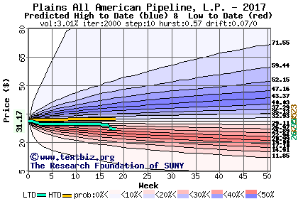 The high to date and low to date prices of the stock plotted against a random walk model for 2017 (what's this?).