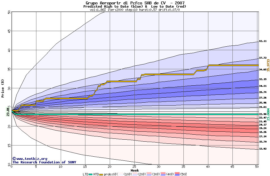 The high to date and low to date prices of the stock plotted against a random walk model for 2007 (what's this?).