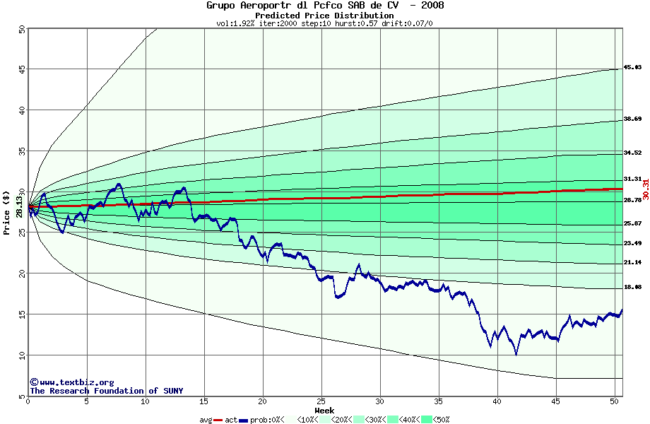 The following graph plots the year-to-date performance of the stock for 2008 compared to the probability calculated by a random walk model.