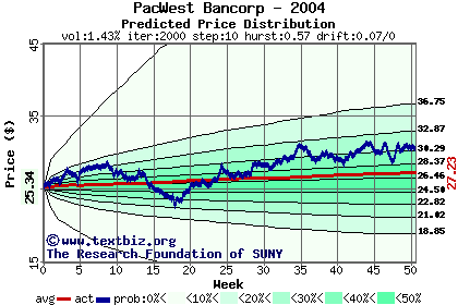 The following graph plots the year-to-date performance of the stock for 2004 compared to the probability calculated by a random walk model.