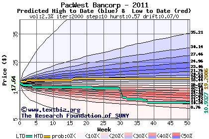 The high to date and low to date prices of the stock plotted against a random walk model for 2011 (what's this?).