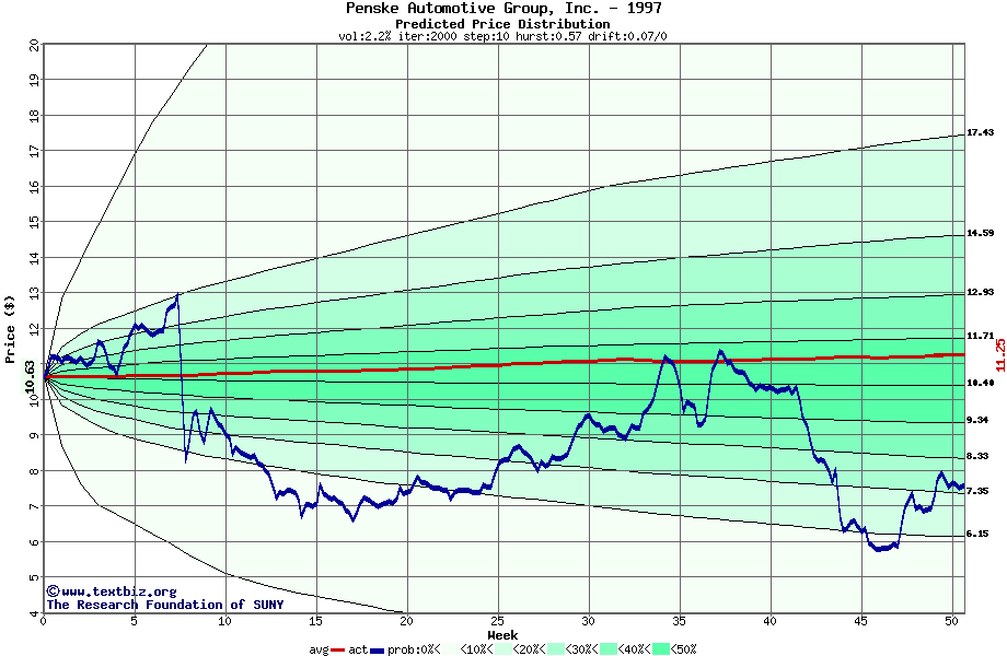 The following graph plots the year-to-date performance of the stock for 1997 compared to the probability calculated by a random walk model.