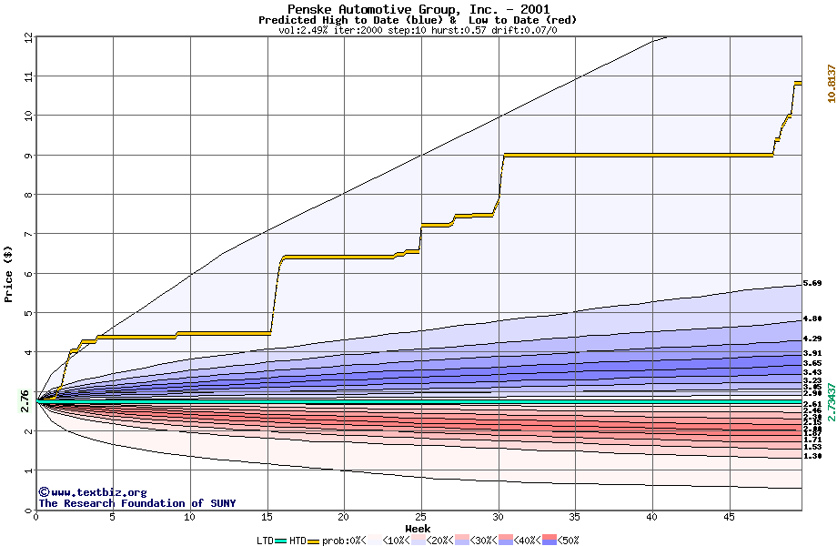 The high to date and low to date prices of the stock plotted against a random walk model for 2001 (what's this?).