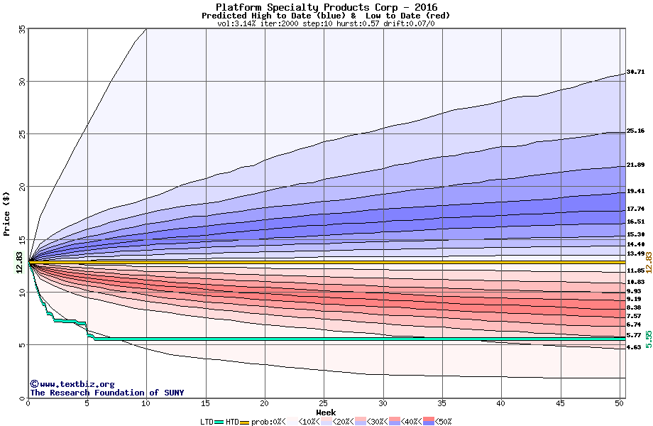 The high to date and low to date prices of the stock plotted against a random walk model for 2016 (what's this?).