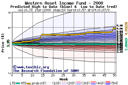 The high to date and low to date prices of the stock plotted against a random walk model for 2000 (what's this?).