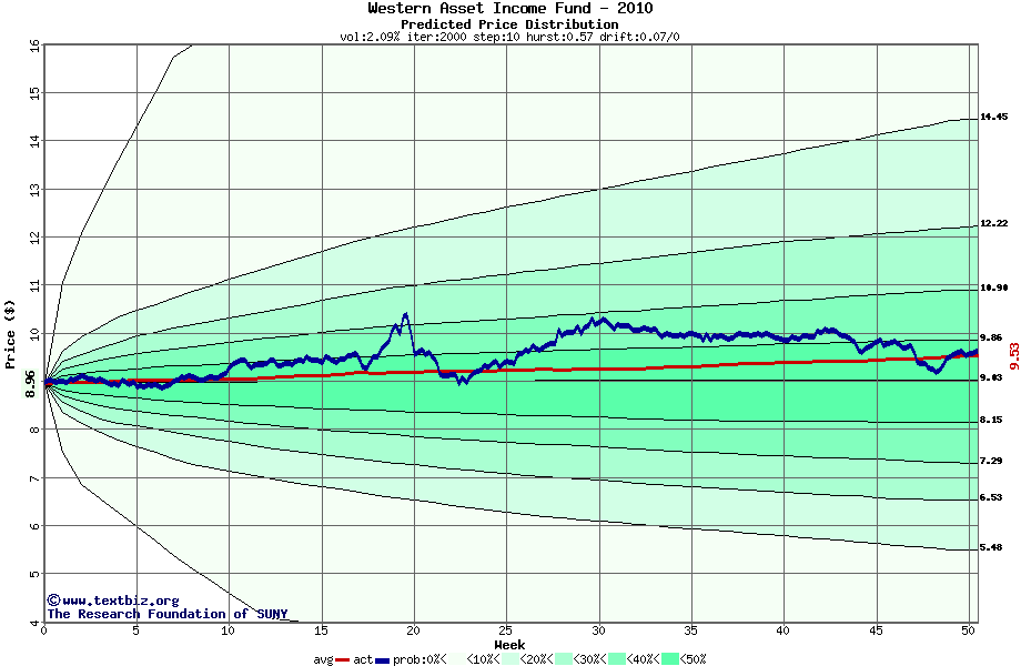 The following graph plots the year-to-date performance of the stock for 2010 compared to the probability calculated by a random walk model.