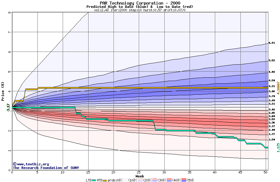 The high to date and low to date prices of the stock plotted against a random walk model for 2000 (what's this?).