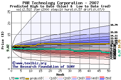 The high to date and low to date prices of the stock plotted against a random walk model for 2007 (what's this?).