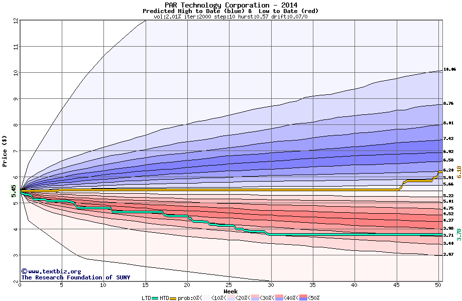 The high to date and low to date prices of the stock plotted against a random walk model for 2014 (what's this?).