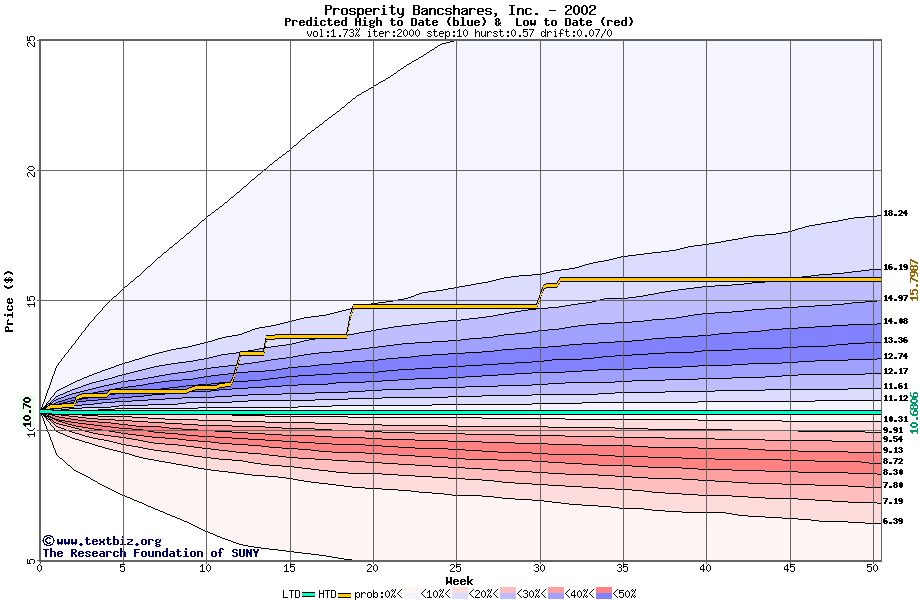 The high to date and low to date prices of the stock plotted against a random walk model for 2002 (what's this?).
