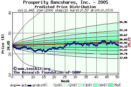 The following graph plots the year-to-date performance of the stock for 2005 compared to the probability calculated by a random walk model.