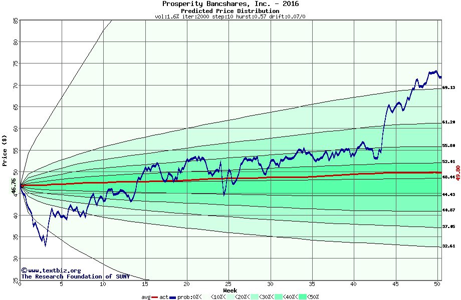 The following graph plots the year-to-date performance of the stock for 2016 compared to the probability calculated by a random walk model.
