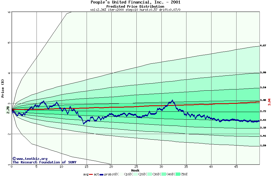 The following graph plots the year-to-date performance of the stock for 2001 compared to the probability calculated by a random walk model.