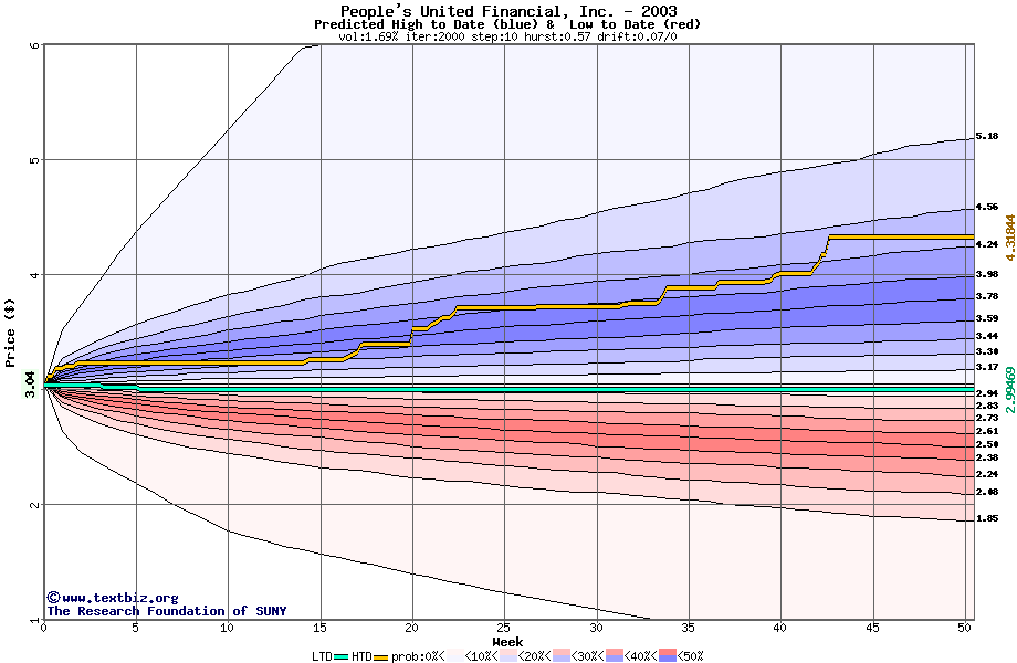 The high to date and low to date prices of the stock plotted against a random walk model for 2003 (what's this?).