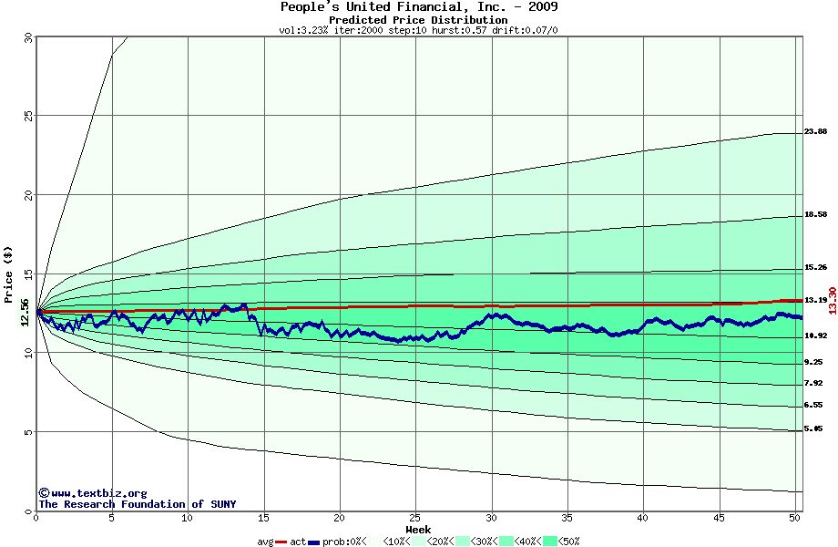 The following graph plots the year-to-date performance of the stock for 2009 compared to the probability calculated by a random walk model.