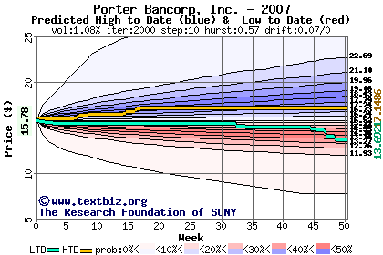 The high to date and low to date prices of the stock plotted against a random walk model for 2007 (what's this?).