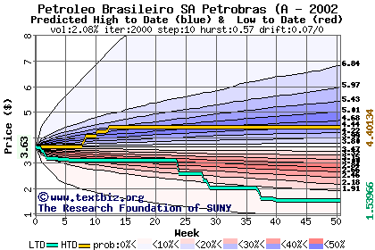 The high to date and low to date prices of the stock plotted against a random walk model for 2002 (what's this?).