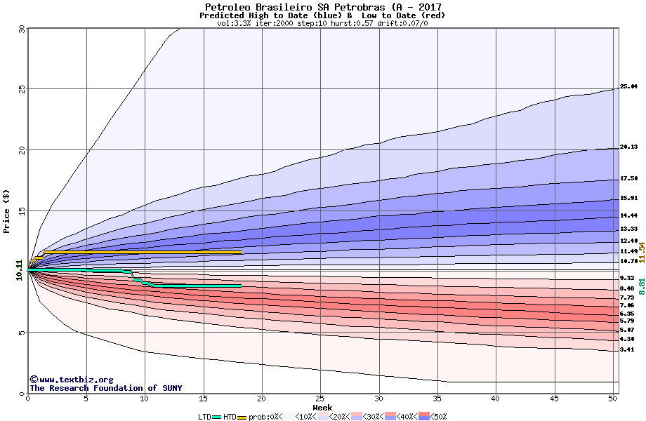 The high to date and low to date prices of the stock plotted against a random walk model for 2017 (what's this?).
