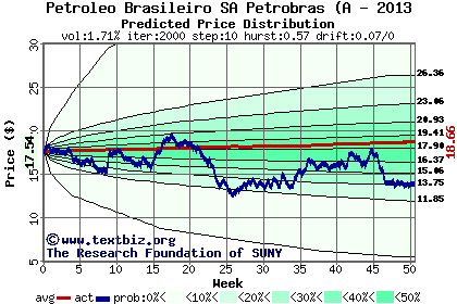 The high to date and low to date prices of the stock plotted against a random walk model for 2013 (what's this?).