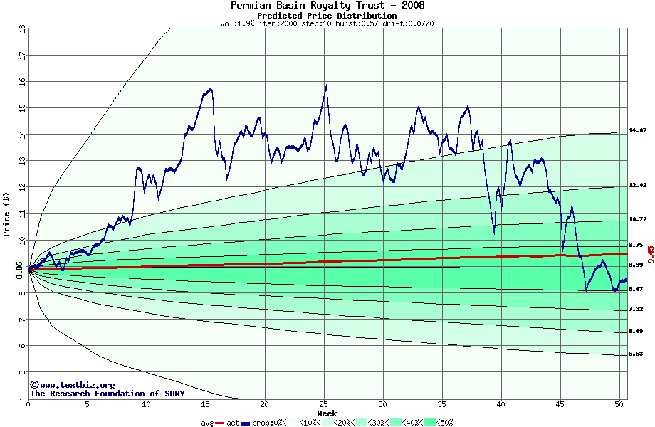 The following graph plots the year-to-date performance of the stock for 2008 compared to the probability calculated by a random walk model.