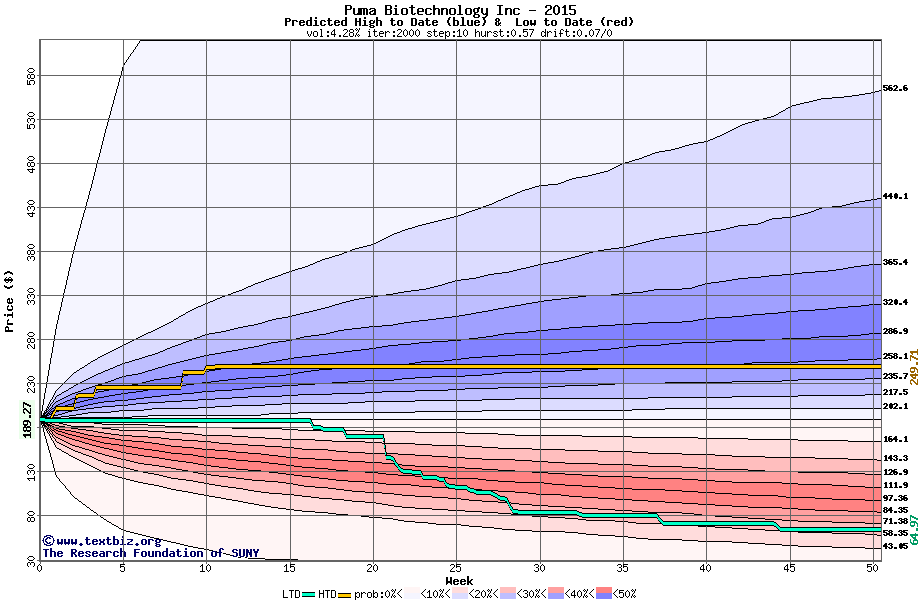 The high to date and low to date prices of the stock plotted against a random walk model for 2015 (what's this?).