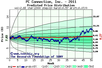 The high to date and low to date prices of the stock plotted against a random walk model for 2011 (what's this?).