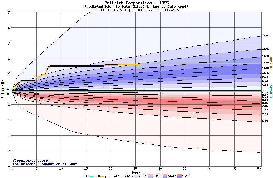 The high to date and low to date prices of the stock plotted against a random walk model for 1995 (what's this?).