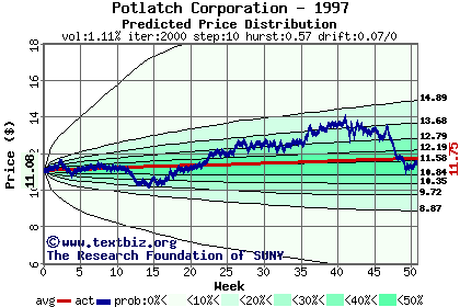 The high to date and low to date prices of the stock plotted against a random walk model for 1997 (what's this?).