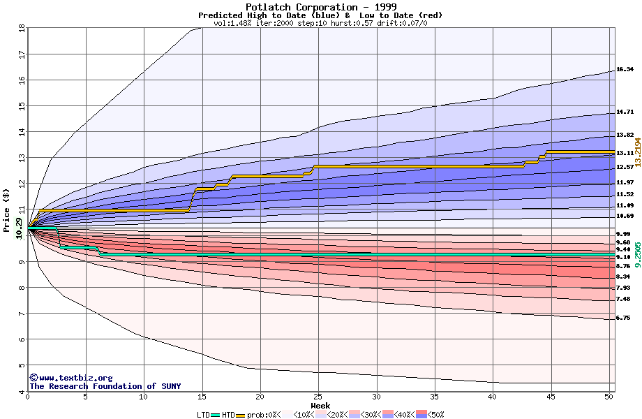 The high to date and low to date prices of the stock plotted against a random walk model for 1999 (what's this?).